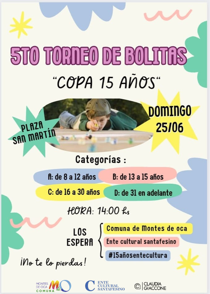 SE VIENE UNA NUEVA EDICIÓN DEL CAMPEONATO DE BOLITAS 25 de junio- 14 hs. Plaza San Martín Categorías: -A. 8 a 12 años -B. 13 a 15 años -C. 16 a 30 años -D. 31 en adelante Organiza: Ente Cultural Santafesino y Comuna de Montes de Oca #ComunadeMontesdeOca#GestiónEmanuelSagripanti#15añosEntecultura