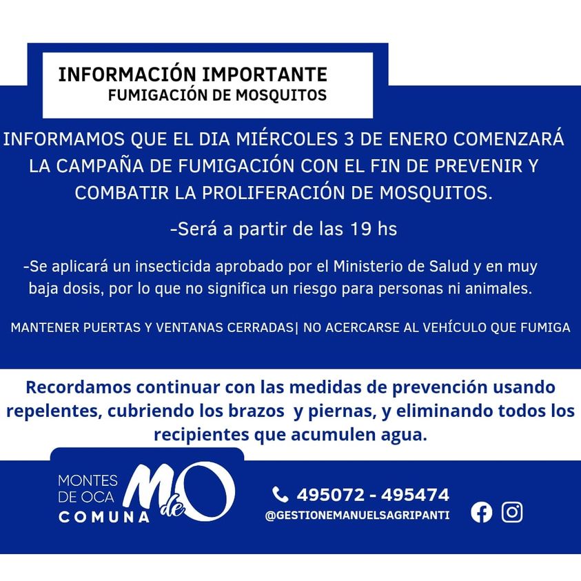 El día miércoles 3 de enero comenzará la campaña de 𝐅𝐔𝐌𝐈𝐆𝐀𝐂𝐈Ó𝐍 𝐂𝐎𝐍𝐓𝐑𝐀 𝐌𝐎𝐒𝐐𝐔𝐈𝐓𝐎𝐒 – A partir de las 19 horas 𝗜𝗠𝗣𝗢𝗥𝗧𝗔𝗡𝗧𝗘 Mantener puertas y ventanas cerradas | No acercarse al vehículo que fumiga Tener en cuenta que se trata de un insecticida aprobado por el Ministerio de Salud, y en una dosis muy baja, por… Seguí leyendo INFORMACIÓN IMPORTANTE| FUMIGACIÓN PARA PREVENIR Y COMBATIR LA PROLIFERACIÓN DE MOSQUITOS.