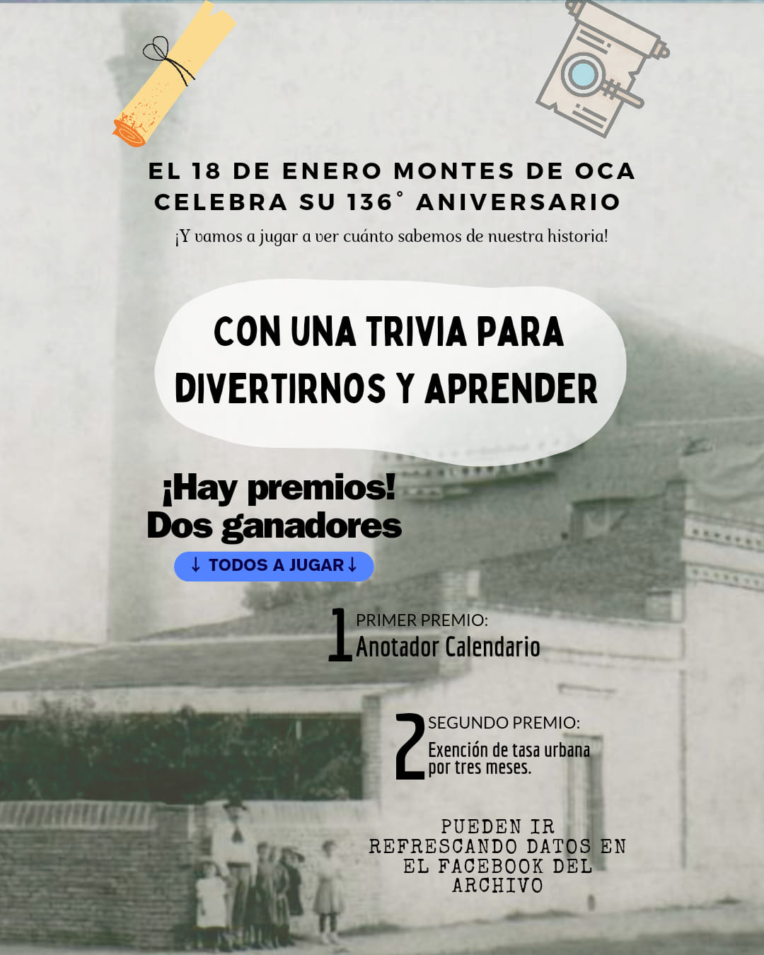 Los invitamos a aprender jugando en esta trivia iniciativa del Archivo de la Memoria Colectiva del Pueblo de Montes de Oca. Nos encantaría que se unan a los vecinos y vecinas que ya se sumaron para ser parte de la a construcción de una historia local identitaria y así continuar abriendo las puertas a la… Seguí leyendo En el marco del 136º Aniversario de la Fundación de la Colonia y Pueblo de Montes de Oca